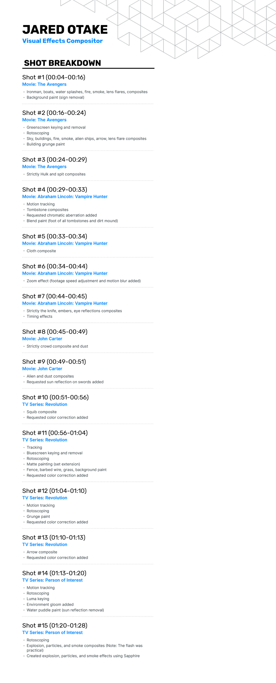 In this section, I'd like to share my visual effects compositing reel, shot breakdown, and IMDB credit list.